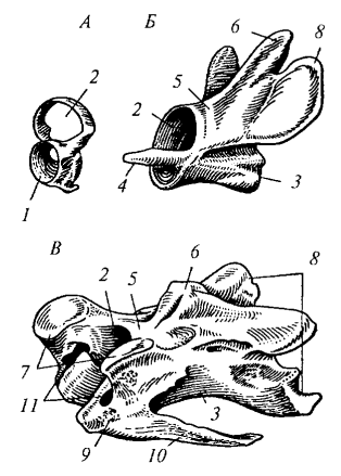 Рис. 105. Шейные позвонки вороны: А — атлант; Б — эпистрофей; В — средний шейный позвонок: 1 — сочленовная ямка для затылочного мыщелка; 2 — канал для спинного мозга; 3 — тело позвонка; 4 — зубовидный отросток; 5 — верхняя дуга; 6 — остистый отросток; 7 — передние сочленовные отростки; 8 — задние сочленовные отростки; 9 — поперечный отросток; 10 — шейное ребро; 11 — позвоночное отверстие