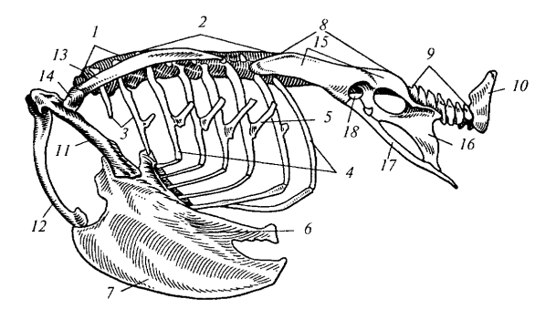 Рис. 106. Скелет туловища вороны сбоку: 1 — последние шейные позвонки; 2 — сросшиеся грудные позвонки (спинная кость); 3 — шейные ребра; 4 — грудные ребра; 5 — крючковидный отросток; 6 — тело грудины; 7 — киль грудины; 8 — сложный крестец; 9 — подвижные хвостовые позвонки; 10 — пигостиль; 11 — коракоид; 12 — вилочка; 13 — лопатка; 14 — суставная впадина для головки плеча; 15 — подвздошная кость; 16 — седалищная кость; 17 — лобковая кость; 18 — вертлужная впадина