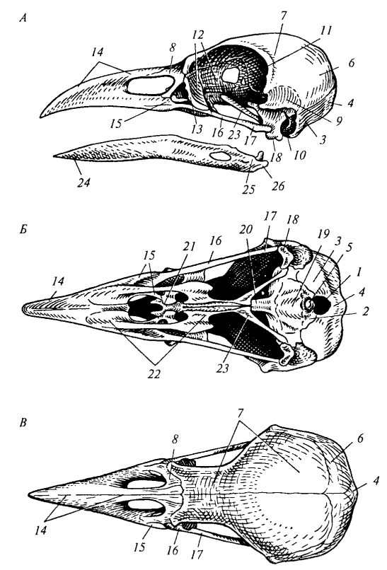 Рис. 108. Череп вороны: А — сбоку; Б — снизу; В — сверху: 1 — большое затылочное отверстие; 2 — основная затылочная кость; 3 — боковая затылочная кость; 4 — верхняя затылочная кость; 5 — затылочный мыщелок; 6 — теменная кость; 7 — лобная кость; 8 — носовая кость; 9 — чешуйчатая кость; 10 — наружный слуховой проход; 11 — боковая клиновидная кость; 12 — средняя обонятельная кость; 13 — слезная кость; 14 — предчелюстная кость; 15 — верхнечелюстная кость; 16 — скуловая кость; 17 — квадратно-скуловая кость; 18 — квадратная кость; 19 — основная височная кость; 20 — клювовидный отросток парасфеноида; 21 — сошник; 22 — нёбная кость; 23 — крыловидная кость; 24 — зубная кость; 25 — сочленовная кость; 26 — угловая кость