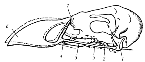 Рис. 109. Схема кинетизма черепа птицы: 1 — квадратная кость; 2 — крыловидная кость; 3 — нёбная кость; 4 — скуловая кость; 5 — квадратно-скуловая кость; 6 — надклювье; 7 — место перегиба носовых костей