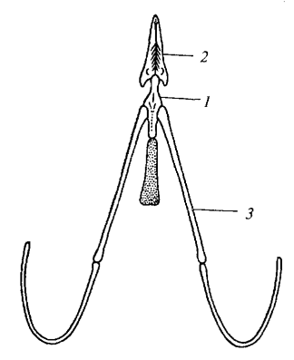 Рис. 110. Подъязычный аппарат вороны: 1 — тело; 2 — скелет собственно языка; 3 — рожок