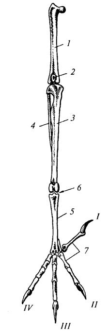 Рис. 112. Скелет задней конечности вороны: 1 — бедренная кость; 2 — коленная чашечка; 3 — голено-предплюсна; 4 — малая берцовая кость; 5 — цевка; 6 — интертарзальный сустав; 7 — фаланги пальцев; I–IV — пальцы
