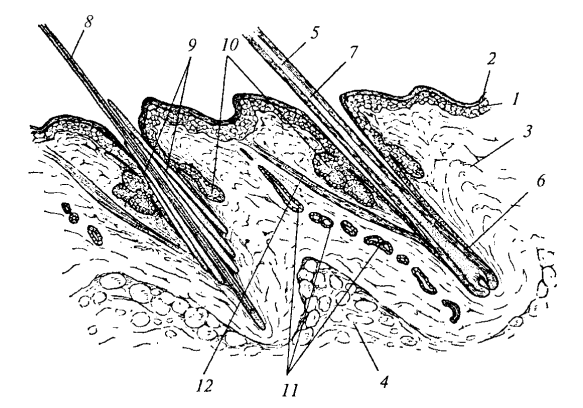 Рис. 161. Схема поперечного среза кожи собаки: 1 — эпидермис; 2 — ороговевшие слои эпидермиса; 3 — дерма (кориум); 4 — подкожная клетчатка; 5 — стержень волоса; 6 — корень волоса; 7 — направляющий волос; 8 — остевой волос; 9 — пуховой волос; 10 — сальная железа; 11 — потовая железа; 12 — мышца, поднимающая волос
