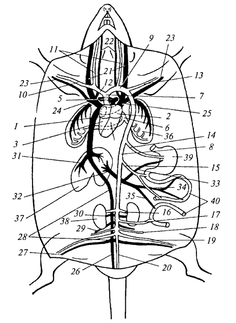 От дуги аорты отходит короткая безымянная артерия (arteria anonyma) , делящаяся на правую подключичную и правую сонную артерии. Затем самостоятельно отходят левая сонная и левая подключичная артерии. Сонные артерии снабжают кровью голову, а подключичные — передние конечности. В брюшной полости от спинной аорты (aorta dorsalis) отходят внутренностная, брыжеечные, почечные и половые артерии.
