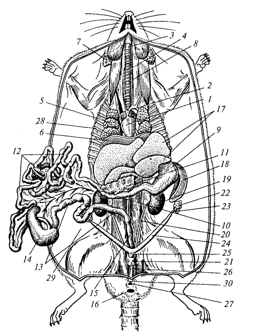 Рис. 163. Общее расположение внутренних органов самки крысы: 1 — сердце; 2 — левая дуга аорты; 3 — гортань; 4 — трахея; 5 — легкое; 6 — диафрагма; 7 — околоушная слюнная железа; 8 — пищевод; 9 — желудок; 10 — двенадцатиперстная кишка; 11 — поджелудочная железа; 12 — тонкая кишка; 13 — толстая кишка; 14 — слепая кишка; 15 — прямая кишка; 16 — анальное отверстие; 17 — печень; 18 — селезенка; 19 — почка; 20 — мочеточник; 21 — мочевой пузырь; 22 — яичник; 23 — яйцевод; 24 — рог матки; 25 — матка; 26 — влагалище; 27 — половое отверстие; 28 — грудная полость; 29 — брюшная полость; 30 — мочевое отверстие