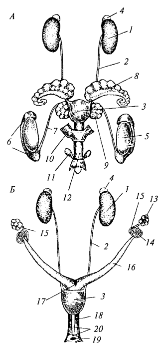 Рис. 164. Мочеполовая система крысы: А — самец; Б — самка: 1 — почка; 2 — мочеточник; 3 — мочевой пузырь; 4 — надпочечник; 5 — семенник; 6 — придаток семенника; 7 — семяпровод; 8 — семенной пузырек; 9 — предстательная железа; 10 — обрезок мышцы; 11 — препуциальная железа; 12 — половой член; 13 — яичник; 14 — яйцевод; 15 — воронка яйцевода; 16 — рог матки; 17 — матка; 18 — влагалище; 19 — половое отверстие; 20 — мочевое отверстие