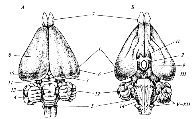 Рис. 165. Головной мозг кролика: А — вид сверху; Б — вид снизу: 1 — передний мозг; 2 — промежуточный мозг; 3 — средний мозг; 4 — мозжечок; 5 — продолговатый мозг; 6 — полушария переднего мозга; 7 — обонятельные луковицы; 8 — новая кора; 9 — гипофиз; 10 — эпифиз; 11 — четверохолмие; 12 — полушария мозжечка; 13 — червячок мозжечка; 14 — пирамиды; II; III; V—XII — головные нервы