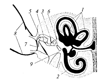 Рис. 169. Схема строения уха млекопитающих: 1 — полукружные каналы; 2 — улитка; 3 — стремечко; 4 — наковальня; 5 — молоточек; 6 — овальное окно; 7 — барабанная перепонка; 8 — наружное ухо; 9 — круглое окно