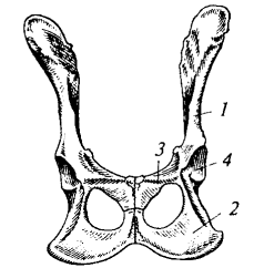 Рис. 171. Тазовый пояс лисицы (вид снизу): 1 — подвздошная кость; 2 — седалищная кость; 3 — лобковая кость; 4 — вертлужная впадина