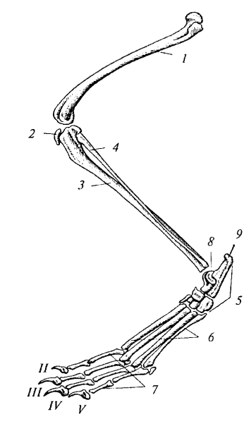 Рис. 172. Задняя конечность лисицы: 1 — бедренная кость; 2 — коленная чашечка; 3 — большая берцовая кость; 4 — малая берцовая кость; 5 — предплюсна; 6 — плюсна; 7 — фаланги пальцев; 8 — таранная кость; 9 — пяточная кость