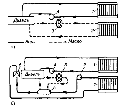 В обеих схемах циркуляцию теплоносителей обеспечивают масляные 3 и водяные насосы (4 в первой схеме; 4 и 6 — во второй). Воздух для наддува дизеля обычно охлаждается в воздухоохладителе водой, а на тепловозах с гидропередачей теплота от последней отводится рабочей жидкостью (маслом) через дополнительные теплообменники.