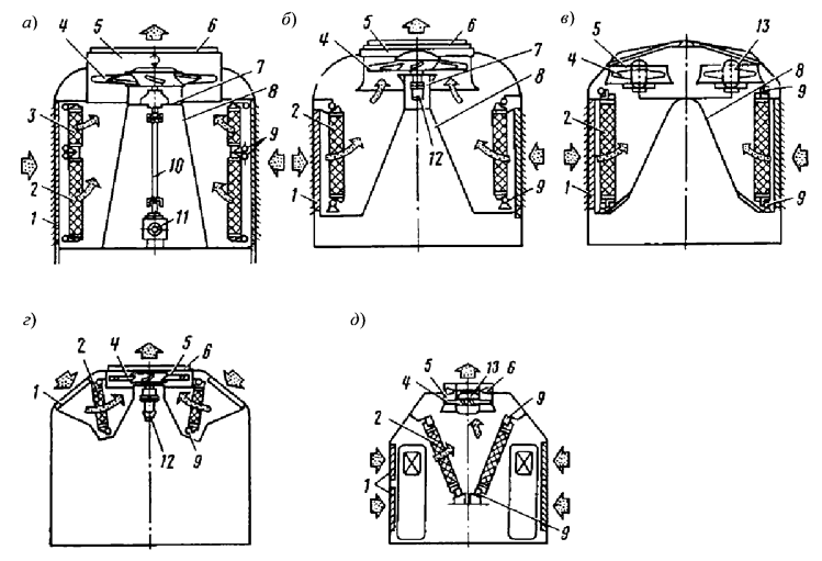 Рис. 2.3.4. Схемы размещения радиаторов и вентиляторов охлаждающих устройств на тепловозах серий: a-2ТЭ10В (М, У); б-ТЭП60; в - 2ТЭ116; г - ТГ16; д - ТЭ109; 1 - боковые жалюзи; 2 и 3 - секции радиаторов; 4 - вентилятор; 5 - диффузор вентилятора; 6 - верхние жалюзи; 7 - горизонтальный лист (потолок) шахты; 8 - арка; 9 - коллектор; 10- карданный вал привода вентилятора; 11 - редуктор; 12 - гидромотор привода вентилятора; 13 - электродвигатель привода вентилятора