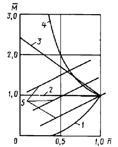 Рисунок 2.4.10. Зависимость относительного крутящего момента М на выходном валу двигателя от относительной частоты вращения n при работе ГТД по внешней характеристике: 1 - одновальный ГТД; 2 - дизель; 3 - ГТД со свободной тяговой турбиной; 4 - идеальная тяговая характеристика; 5 - кривые сопротивления движению поезда для различных подъемов