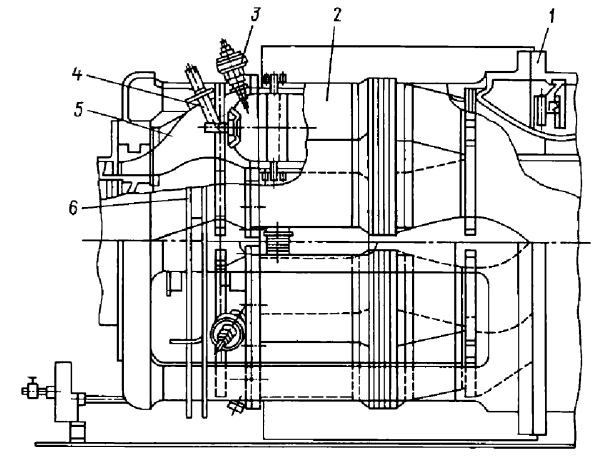 Рисунок 2.4.11. Блок камер сгорания газотурбовоза Г1-01: 1 - турбина; 2 - прямоточная камера (секция); 3 - свеча; 4 - двухконтурная центробежная форсунка; 5 - компрессор; 6 - кольцевые трубопроводы