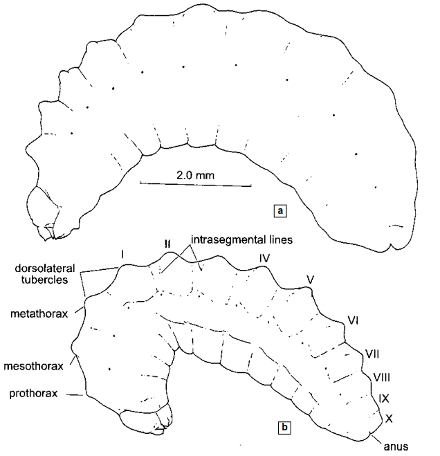 На рисунке 4-2 показано превращение зрелой личинки в препупупу на последнем этапе развития Neffapis longilongua Ruz. a — личинка, предшествующая дефекации; b — личинка или препупупа после дефекации. (Брюшные сегменты пронумерованы.) По материалам Rozen and Ruz, 1995.