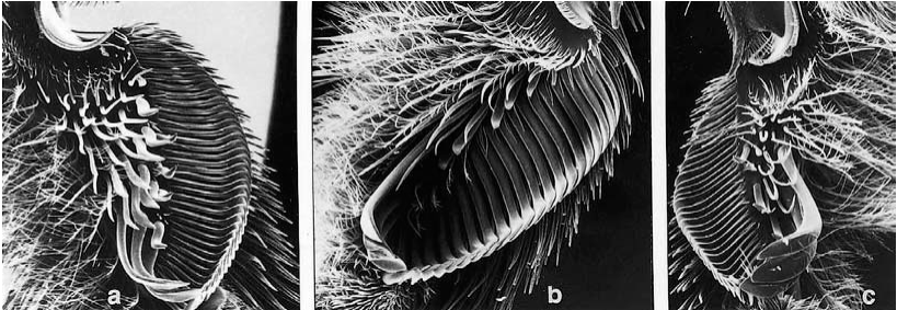 Рисунок 6-3: Вид с вентральной стороны на базитарсусы самок: (a) Centris (Ptilotopus) sp.; (b) C. (Paracentris) близ tricolor Friese; (c) C. (Heterocentris) trigonoides Lepeletier, демонстрирующие гребни из щетинок для сбора масла (по Neff and Simpson, 1981).