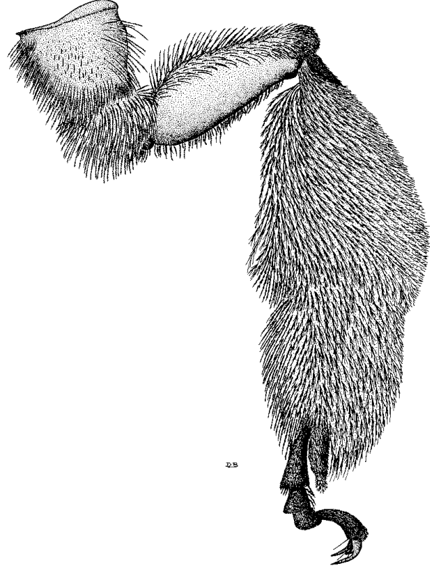 Рисунок 6-4: Задняя нога самки Svastra obliqua (Say), пчелы из трибы Eucerini, демонстрирующая скопу для транспортировки сухой пыльцы на голени и базитарсусе. Оголенная область на нижней внешней поверхности бедра образует бедренную корбикулу, характерную для многих короткоязыких пчел (рисунок D. J. Brothers).