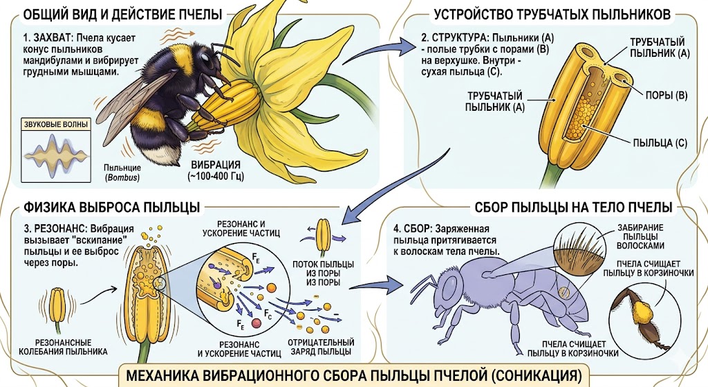 Многие группы пчел, включая олиголектов и полилектов, извлекают пыльцу путем высокочастотной вибрации цветка (соникации). Пчела плотно прижимается к цветку, направляя отверстия пыльников к своему телу, после чего генерирует мощные импульсы. Под воздействием резонанса пыльца буквально «выстреливает» наружу, прилипая к волоскам на теле насекомого для последующей транспортировки. Вибрация создается сокращением грудных мышц, что сопровождается характерным жужжанием, давшим название этому процессу.