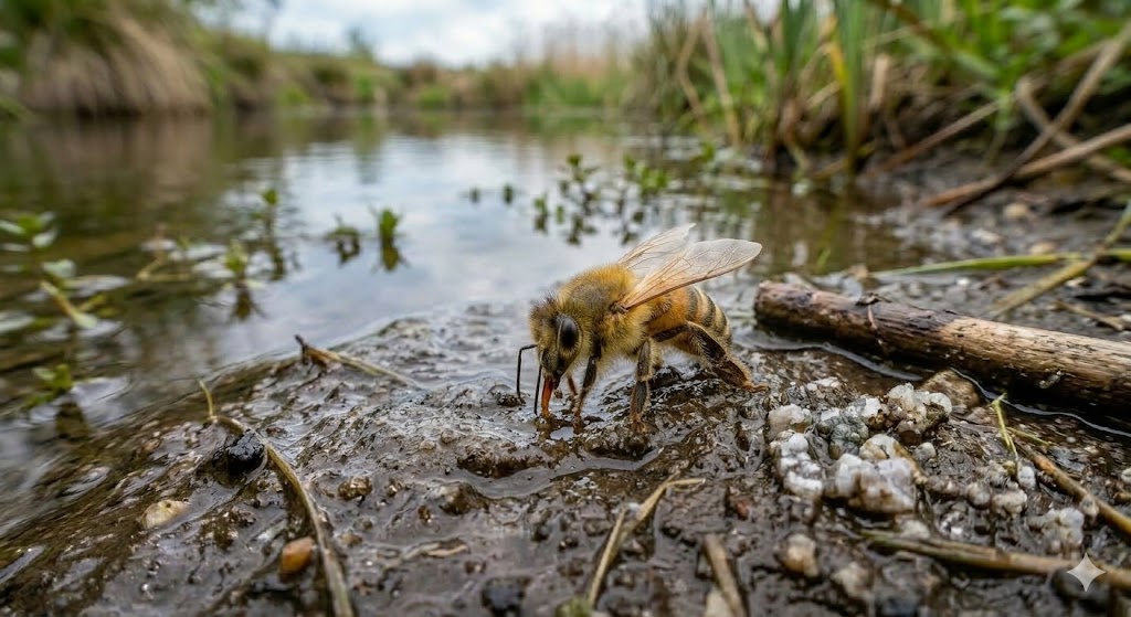 Рисунок 2. Пчела, собирающая минеральные соли на влажной почве у края водоема.