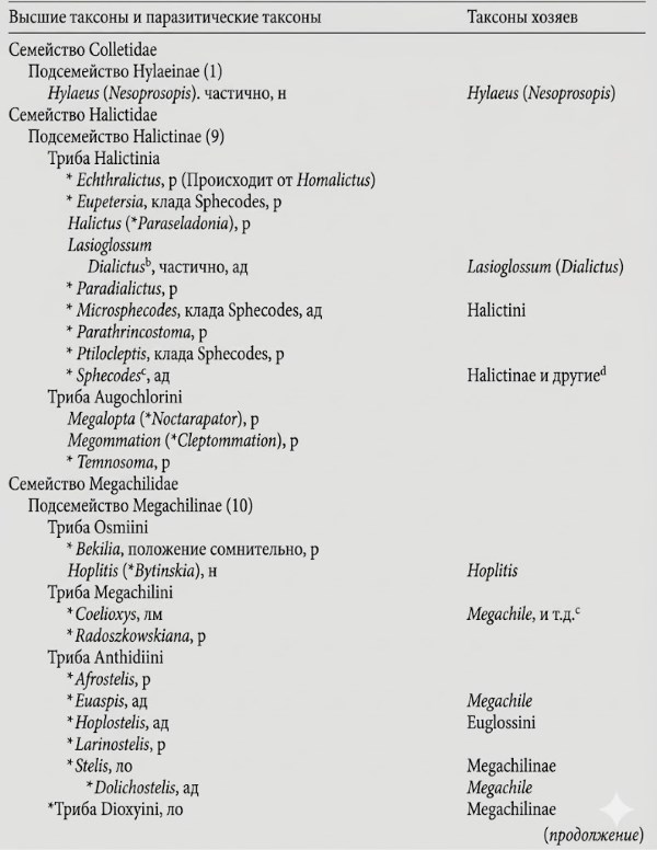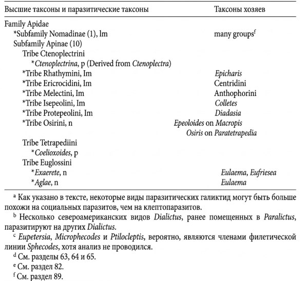 Таблица 8-2. Систематика и особенности клептопаразитических пчел. Примечания: (p) Вероятный клептопаразит (см. раздел 8c); (n) Обнаружен в гнездах хозяев или выращен из них, но механизм уничтожения яиц или личинок неизвестен; (ad) Яйцо или личинка хозяина уничтожаются взрослой самкой паразита (предполагается при отсутствии клеток с одновременным содержанием яиц хозяина и паразита); (lo) Гибель яйца или молодой личинки хозяина происходит от активной личинки паразита с обычной морфологией; (lm) Уничтожение обеспечивается специализированной молодой личинкой со склеротизированной головой и серповидными мандибулами. Цифры в скобках указывают на вероятное количество независимых случаев возникновения клептопаразитизма. Звездочка (*) обозначает таксоны, все виды которых являются паразитическими. Социальные паразиты в список не включены (см. таблицу 8-1).