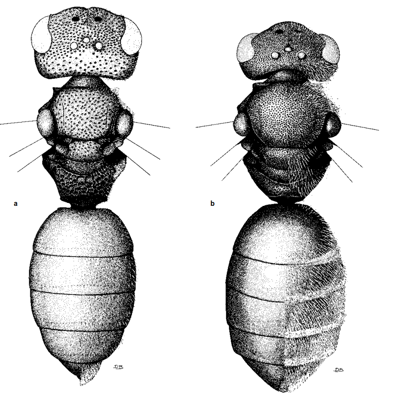 Рисунок 8-2. Сравнение морфологии самок Halictini: а — клептопаразитический вид Sphecodes monilicornis (Кирби) с характерной грубой пунктуацией и сильными дорсолатеральными углами переднеспинки; б — непаразитический вид Lasioglossum malachurum (Кирби). На левой половине каждого рисунка волосяной покров удален. Рисунок Д. Дж. Бразерса из Michener, 1978b.