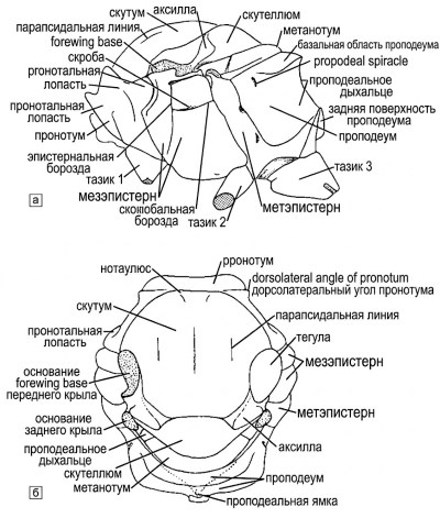 Рисунок 10-5. Схема грудной клетки пчелы: а — вид сбоку; б — вид сзади. На рисунке а опущена перегородка, на рисунке б — левая сторона. Проподеальный треугольник обозначен пунктирными линиями на рисунке б. Из работы Миченера, Макгинли и Данфорта, 1994.