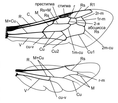 Рисунок 10-6. Схема крыльев пчелы, иллюстрирующая терминологию Миченера (Michener, 1944). По материалам Michener, McGinley, and Danforth, 1994.