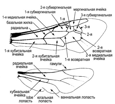 Названия ячеек и некоторые нейтральные обозначения жилок показаны на рисунке 10-7, а в таблице 10-1 приведены эквиваленты этих названий в терминах системы Комстока-Нидхэма. Особое значение имеют три жилки, которые выглядят как поперечные: вторая абсцисса Rs, первая жилка r-m и вторая жилка r-m (по системе Комстока-Нидхэма). Именно эти структуры определяют количество субмаргинальных ячеек — обычно их три или две.