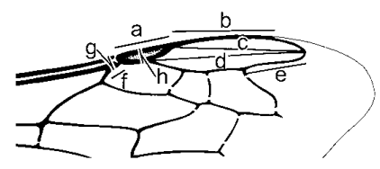Рисунок 10-8. Переднее крыло Ceratina rupestris Holmberg с указанием способов измерений: (а) длина стигмы; (б) длина костального края маргинальной ячейки; (в) длина маргинальной ячейки за пределами стигмы; (г) общая длина маргинальной ячейки; (д) длина свободной части маргинальной ячейки; (е) длина престигмы; (ж) ширина престигмы (до края крыла); (з) ширина стигмы. Разрывы в жилках — боковые окна.