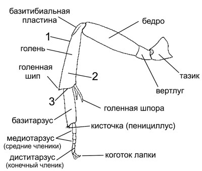 Внутренняя поверхность задней голени имеет особое таксономическое значение. Обычно она несет два гребенчатых края, причем именно внутренний край часто модифицирован различными способами. Следуя традиции, этот край называется реснитчатым, если он несет тонкие, почти волосковидные выступы (обычно многочисленные). Во многих случаях такие выступы создают впечатление тонкого гребня. Мелкозубчатое или реснитчатое состояние (или промежуточные формы) характерно для перепончатокрылых (Gennerich, 1922). Аналогичным образом, наружная задняя голенная шпора и средняя голенная шпора часто описываются как простые, то есть немодифицированные.