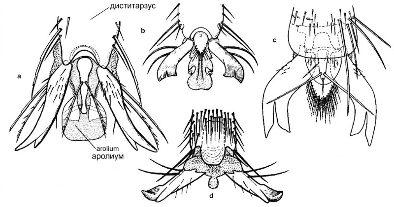 Между коготками лапки часто имеется выступающий подушечкообразный аролиум (рис. 10-10). Его нижние дистальные поверхности почти всегда темные, часто черные, что помогает отличить его от сопутствующих бледных структур. Детальное строение структур между коготками описано Миченером (1944) и показано на рисунке 10-10. Вероятно, сравнительное изучение этих образований позволило бы выявить новые признаки, ценные для филогении и систематики пчел. Утрата аролиума у пчел происходила неоднократно в разных филогенетических линиях.