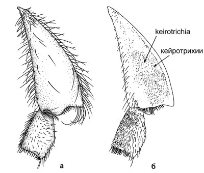 Кейротрихии и структуры лапок. На внутренней поверхности задней голени большинства пчел имеется участок различного размера, покрытый волосками одинаковой длины, обычно тупыми, усеченными или слегка раздвоенными. Эти волоски, кейротрихии (рис. 10-11), по-видимому, служат для чистки крыльев. У некоторых пчел они замещены более длинными и обычными волосками, которые у самок могут выполнять функцию части скопы (собирательного аппарата).