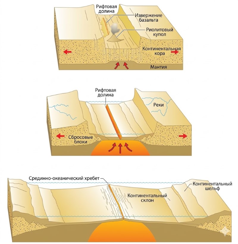 Границы расходящихся плит: механизмы растяжения, континентальные рифты и эволюция океанических бассейнов