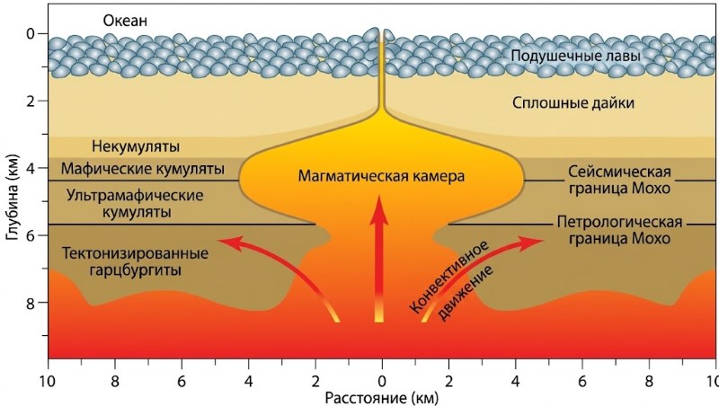 Формирование океанической коры и литосферы на срединно-океанических хребтах происходит следующим образом. Магма образуется в результате частичного плавления в астеносфере и восходящих конвективных потоков, формируя магматическую камеру под осью хребта. По мере расхождения литосферных плит из магматического очага вверх внедряются дайки, которые питают потоки лавы на поверхности дна океана. Тяжелые кристаллы (например, оливин и пироксен) оседают из магматического очага, образуя слои кристаллических кумулятов на его дне