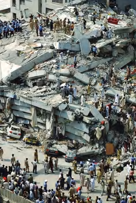 Обрушившийся 10-этажный жилой дом в Исламабаде, Пакистан, после землетрясения 8 октября 2005 года. Здание обрушилось на один этаж, в результате чего обрушились все нижние этажи (Фото AP).