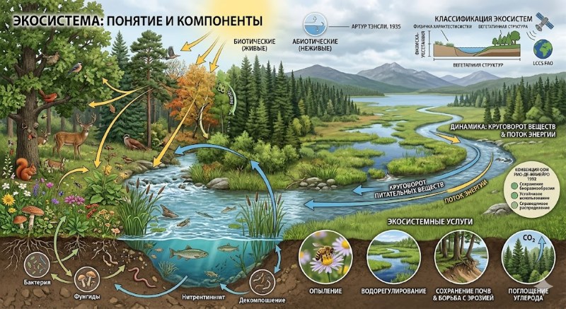 Экосистема представляет собой фундаментальную экологическую единицу, охватывающую всю физическую и биологическую среду конкретной местности, а также сложные взаимосвязи между её компонентами. Данная интегрированная структура состоит из сообщества живых организмов, на которые влияют многочисленные абиотические факторы: температура, влажность, освещённость, состав почвы, запасы пищи, взаимодействия с другими организмами, а также неживые элементы окружающей среды (вещество и энергия). Любая модификация в рамках одного компонента экосистемы неизбежно вызывает соответствующие изменения во всей системе. Взаимоотношения между организмами определяются колебаниями энергозатрат, характером энергетических потоков и процессами круговорота питательных веществ. Термин «экосистема» был введён в 1935 году британским экологом Артуром Тэнсли (1871–1955), который заложил это основополагающее понятие в научный обиход.