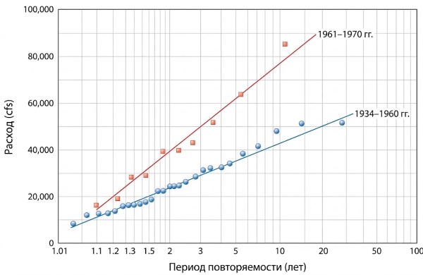 Кривая частоты наводнений для двух разных периодов в различных климатических условиях вдоль реки в Африке. Время повторения (горизонтальная ось) показывает, как часто наводнения с определённым объёмом воды (вертикальная ось — расход в кубических футах в секунду) происходят в конкретном месте. С 1934 по 1960 год на реке был сухой климат, и наводнения были не столь масштабными и частыми, как во влажный период 1961–1970 годов. Изменения климата могут серьёзно повлиять на прогнозируемую частоту наводнений.