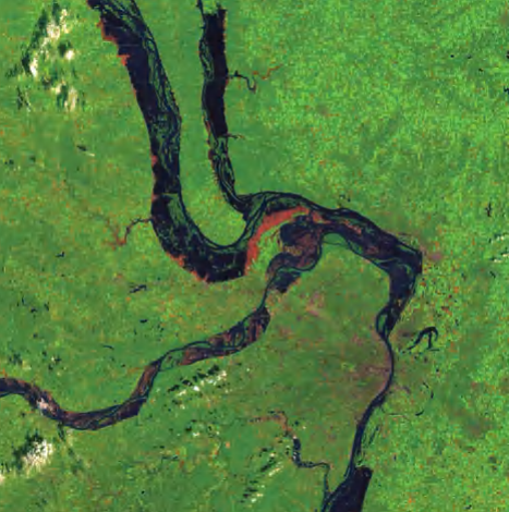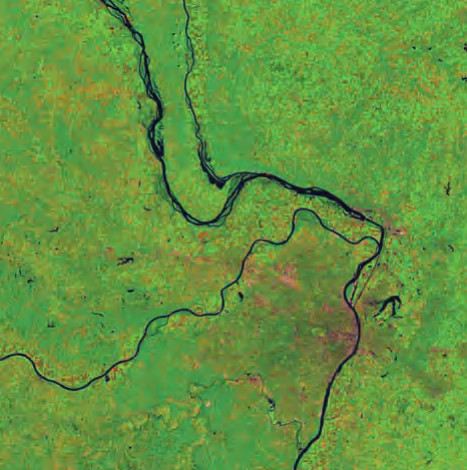Спутниковый снимок района Сент-Луиса, штат Миссури, с реками Миссисипи, Миссури и Иллинойс в нормальном течении (14 августа 1991 г.; снимки НАСА, сделанные Джесси Алленом из Земной обсерватории, с использованием данных, любезно предоставленных научным отделом проекта Landsat)