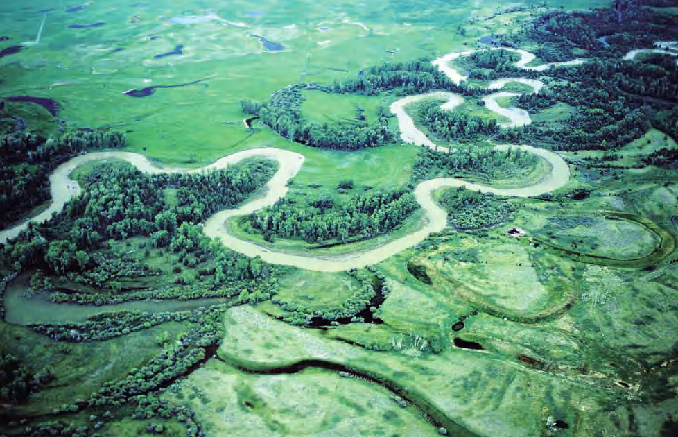 Река Блэкфут в Монтане с естественными изгибами, старицами и поймой