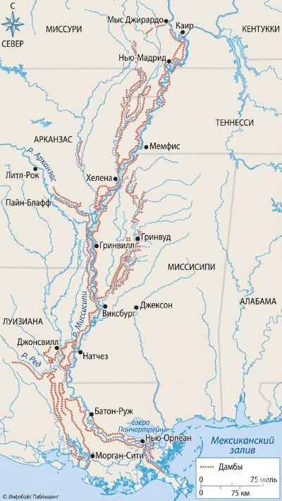 Карта нижнего течения реки Миссисипи от устья дельты до юга Миссури, на которой показаны тысячи миль дамб, построенных вдоль реки в прошлом столетии (курсивом — описание рисунка).