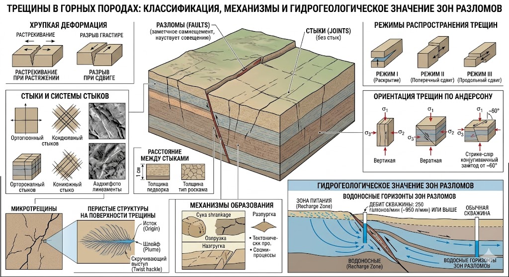 Трещины в горных породах: классификация, механизмы хрупкой деформации и гидрогеологическое значение зон разломов
