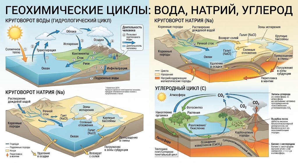 Круговорот натрия. Круговорот натрия — один из важнейших геохимических циклов. Натрий входит в состав горных пород земной коры, донных отложений и океанской воды, перемещаясь между этими резервуарами в течение длительного геологического времени. Дождевая вода растворяет натрий из коренных пород (например, гранита), а ручьи и реки переносят его в виде раствора в море. Натрий (Na) и хлор (Cl) — два наиболее распространённых растворённых элемента в океанской воде; при испарении они соединяются, образуя минерал галит (NaCl). Этот процесс непрерывно происходит в зонах интенсивного испарения вдоль морских побережий. В геологическом прошлом крупные океанические бассейны (Средиземное море, Красное море, молодой Атлантический океан) полностью испарялись, оставляя мощные толщи соляных отложений. Речные воды размывают часть этих отложений и уносят соли обратно в море, замыкая один из циклов.