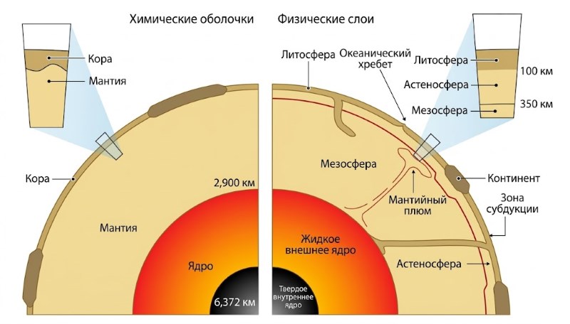 Поперечные сечения Земли, показывающие химические оболочки (кору, мантию и ядро) и физические слои (литосферу, астеносферу, мезосферу, внешнее ядро и внутреннее ядро).