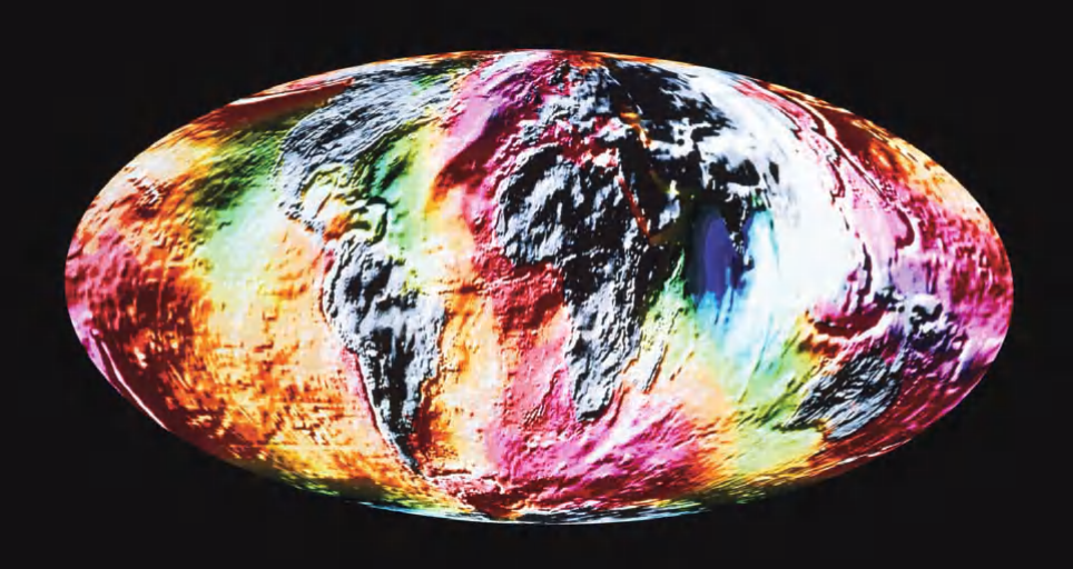 Рельеф поверхности океана. Цвета отображают отклонения от среднего значения поверхности океана, вызванные локальными различиями в гравитационном поле Земли. Фиолетовый цвет соответствует высоте до 280 футов (85 м) выше среднего, затем красный, оранжевый, жёлтый, зелёный и синий (до 345 футов [105 м] ниже среднего).