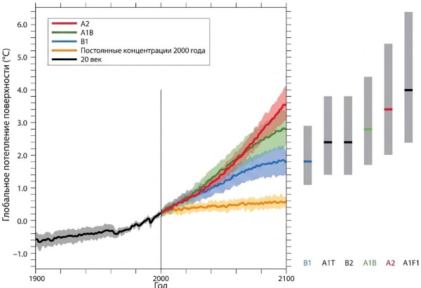 График среднемировых колебаний температуры на планете за последние 1000 лет и прогнозируемая температура к 2100 году по различным моделям. Все модели показывают прогнозируемое повышение температуры в диапазоне от 1,5 до 5,5 °C. (Данные МГЭИК за 2007 год)