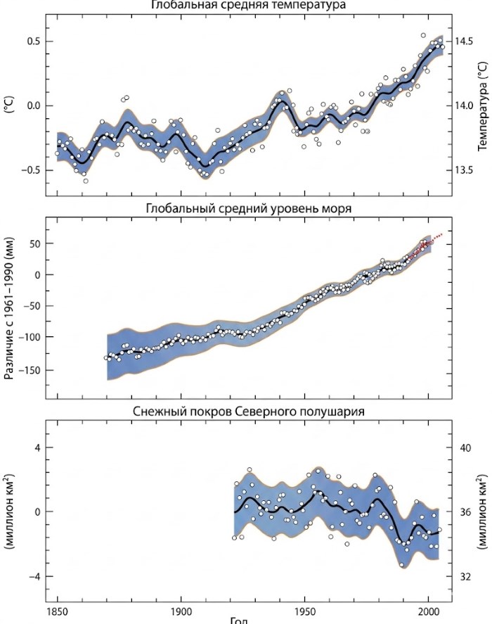 Одиннадцать из двенадцати лет в период с 1996 по 2006 год оказались самыми тёплыми за всю историю инструментальных наблюдений, ведущихся с 1850 года. Повышение температуры ускоряется, причём полярные регионы пострадали сильнее экваториальных. Уровень моря также повышается всё более быстрыми темпами: с 1961 по 1993 год глобальный уровень рос на 0,13–0,23 см/год, а с 1993 года — на 0,24–0,28 см/год. Этот рост частично обусловлен таянием ледников, ледяных шапок и снега, а частично — термическим расширением океанской воды при нагревании. Ледники сокращаются в обоих полушариях, а ледяные шапки Северного Ледовитого океана и некоторых районов Антарктиды быстро уменьшаются.