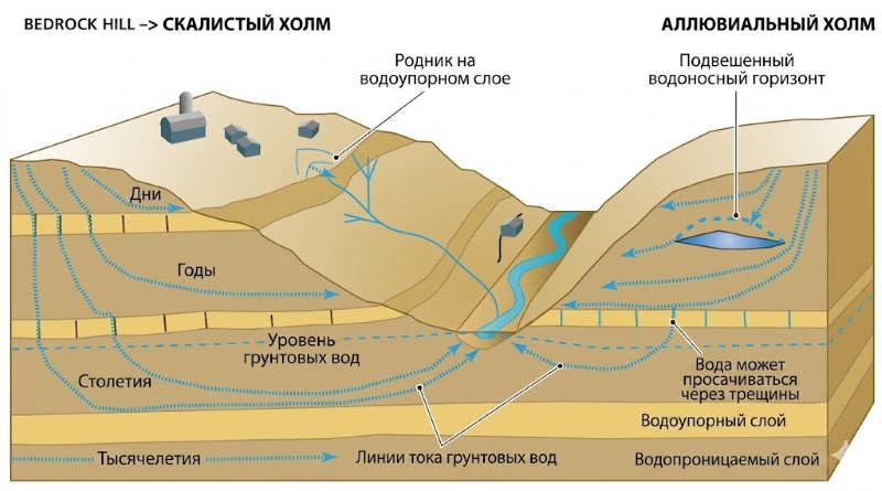 Принципиальная схема системы подземных вод. Вода поступает в систему на склонах холмов и вытекает ниже по склону в виде родников и сточных водотоков (курсивом – описание рисунка).
