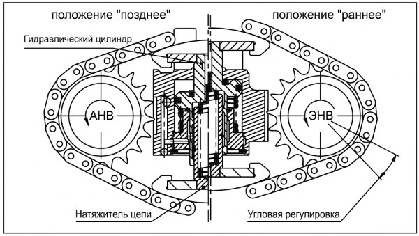 Рис. 10-70. Функциональный принцип работы цепного устройства регулировки фаз ГРМ.