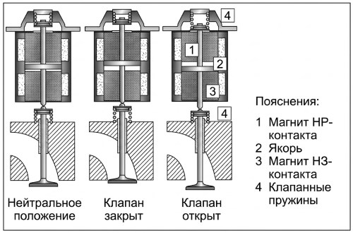 Электромеханические системы: Будущее бескулачковых ГРМ. Наибольшим потенциалом в области управления газообменом обладают бескулачковые (camless) системы. Эти устройства используют актуаторы, способные индивидуально задавать время и высоту открытия для каждого конкретного клапана. Исследования в области электромеханического привода ведутся уже более двух десятилетий, предлагая революционный подход к конструкции ДВС. В такой системе клапан управляется якорем, расположенным между двумя мощными электромагнитными катушками.