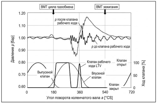 Рис. 10-90. Характеристики давления до и после воздушного тактового клапана при двойном цикле вскрытия на фазе впуска в тихоходном режиме.